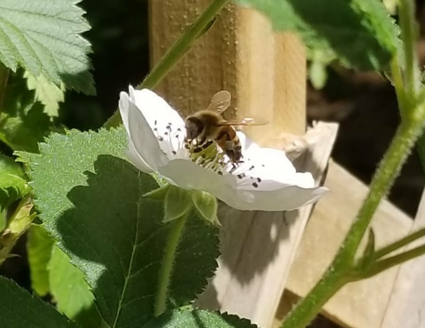 The first year we kept them alive. Hooray for small victories right?! Last year we got enough for a pie; you read that correctly, one pie. I did get some great photos of our honeybees collecting nectar so all was not a loss. I trimmed them back after their gallant effort, mulched heavy over winter, and well forgot about them.